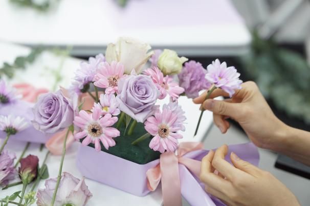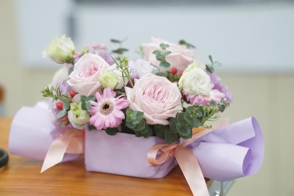 随后,杨雪老师带领大家认识了活动所需的不同花材及资材。团块花材和扶郎花以其独特的形态和艳丽的花色,成为花艺作品中的焦点;而散点花材如日本蓝星花、多头玫瑰和小菊,则以其小巧精致和自然气息,为作品增添了层次感和空间感。
