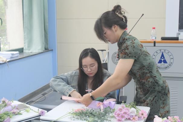 活动伊始,杨雪老师为师生们带来了一场精彩的插花技巧讲座。她从花卉选择、颜色搭配、造型设计等角度进行了生动的讲解,并简要介绍了中西方插花艺术的差异,让在场师生们对插花艺术有了更深的认识。
