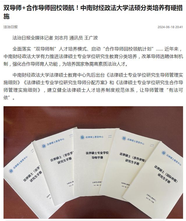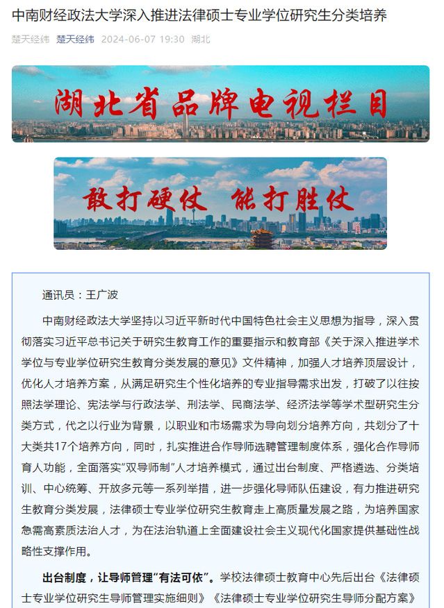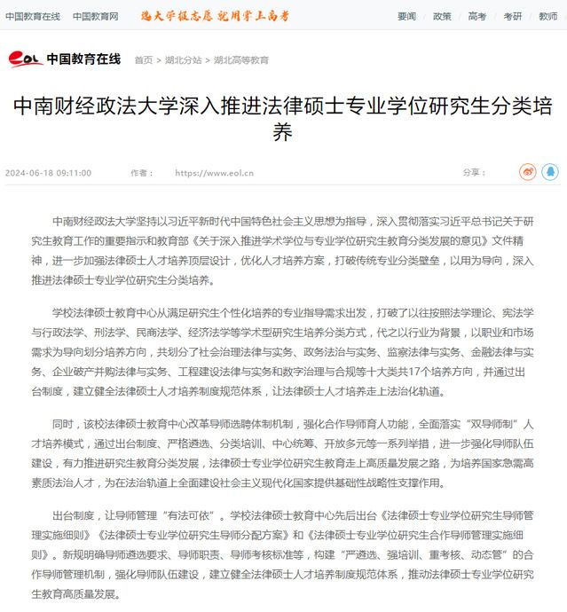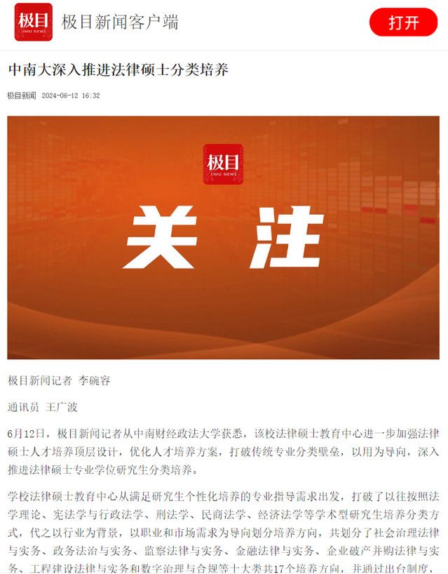 (通讯员 胡盈 张景瑜)为深入贯彻落实习近平总书记关于研究生教育工作的重要指示和教育部《关于深入推进学术学位与专业学位研究生教育分类发展的意见》文件精神,米兰电竞·(中国区)坚持以习近平新时代中国特色社会主义思想为指导,通过加强人才培养顶层设计,优化人才培养方案,科学划分培养方向,强化导师队伍建设等举措,引领法律硕士专业学位研究生教育走上高质量发展之路,形成了具有中南大特色的法律硕士专业学位研究生培养模式,为在法治轨道上全面建设社会主义现代化国家提供基础性战略性支撑。全国法律专业学位研究生教育指导委员会官网、法治日报、中国教育在线、湖北日报、楚天经纬、极目新闻等多家网站和媒体关注报道。