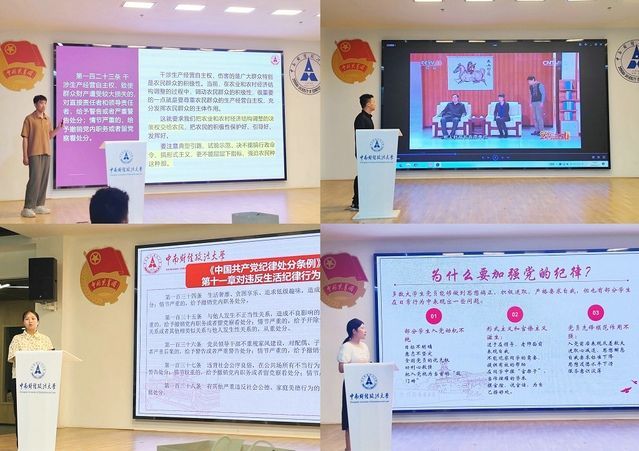 活动采用理论和实践学习相结合的方式,组织党员同志参观中南大监察文化与法治陈列室,详细了解各个朝代的监察文化制度和中国共产党纪检监察史,重点学习党的十八大以来坚持一体推进“三不腐”,在扫黑除恶、金融反腐、医疗反腐等领域取得的显著成效;黄保凯、周嘉豪、何姜丽三名同志通过丰富的图文、详实的数据和鲜活的案例,带领大家原原本本学习《中国共产党纪律处分条例》关于违反群众纪律、工作纪律和生活纪律行为的处分规定;韦晨依同志结合支部工作实际,以《党纪学习中的“三问”》为题,开展第22期“我看新时代”主题党课。她从党的纪律是什么、为什么要学习党的纪律,以及如何维护党的纪律三个层面介绍了加强党纪学习教育的深刻意义与实践路径,为大家进一步校准思想之标、调整行为之舵、绷紧作风之弦。