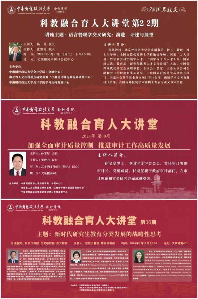 通过持续邀请国内外知名高校、政府部门以及业界的专家学者,“科教融合育人大讲堂”已逐渐成为华中地区财会审研究交流的前沿阵地。