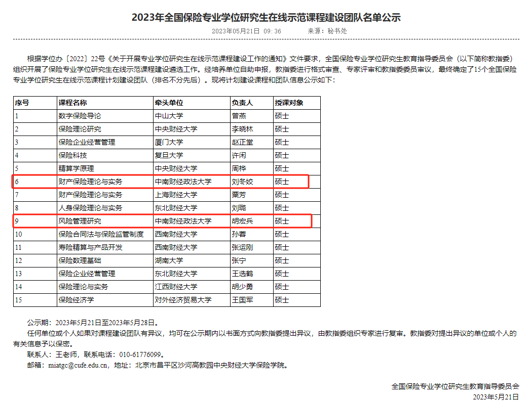 全国保险专业学位在线师范课程建设团队名单