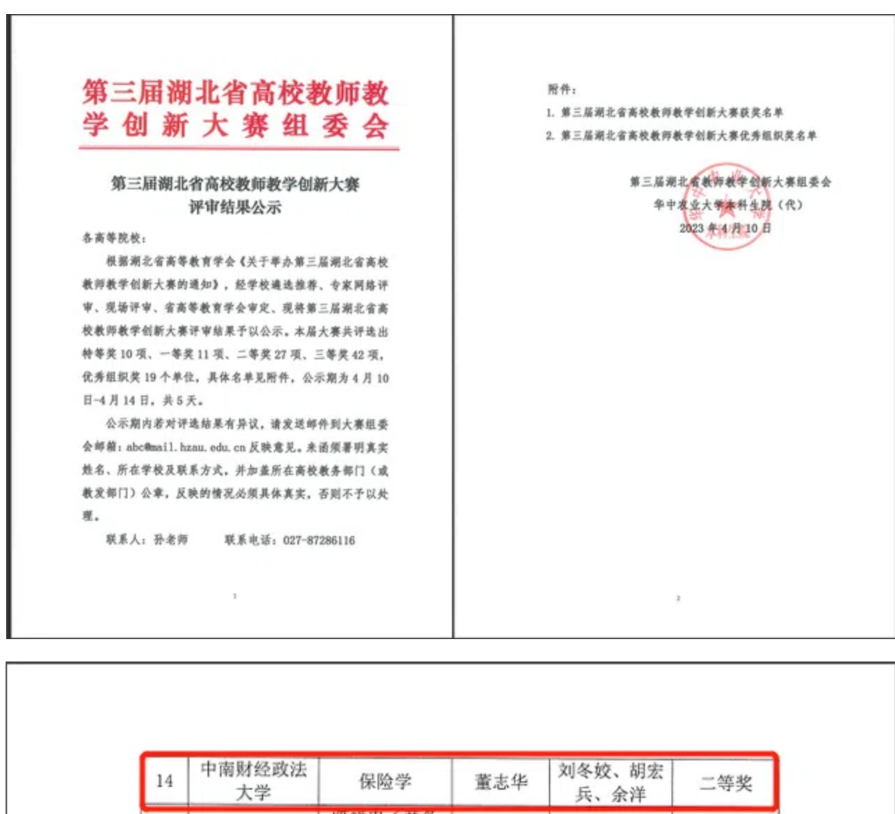 3.开拓创新,提升教学质量。①提高青年教师教学能力。通过举办青年教师讲课竞赛,进一步夯实青年教师教学基本功,增强青年教师课堂驾驭能力,促进课堂教学质量提升,切实提高人才培养质量。②鼓励教师创新教学方法和手段。金融学院统筹推进教学成果、师资团队、优质课程、精品教材等建设,鼓励学院教师创新教学方法,激发学生的学习兴趣和参与度,加深对知识点的理解和应用。董志华老师荣获第三届湖北省高校教师教学创新大赛副高组二等奖。余洋副教授获米兰电竞·(中国区)第三届青年教师讲课竞赛“最佳教案设计奖”。《风险管理研究》和《财产保险理论与实务》入选全国保险专业学位研究生在线示范课程。