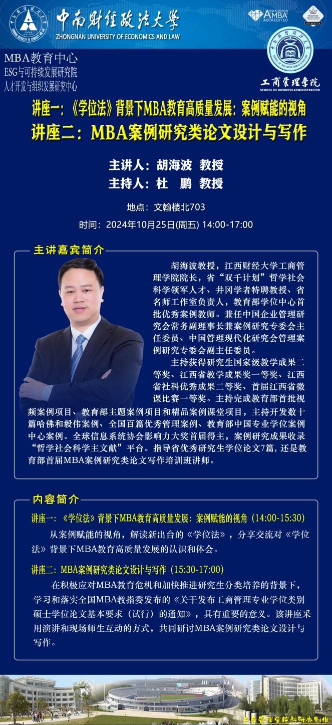 2.在积极应对 MBA 教育危机和加快推进研究生分类培养的背景下,学习和落实全国 MBA 教指委发布的《关于发布工商管理专业学位类别硕士学位论文基本要求(试行)的通知》,具有重要的意义。该讲座采用演讲和现场师生互动的方式,共同研讨 MBA 案例研究类论文设计与写作。