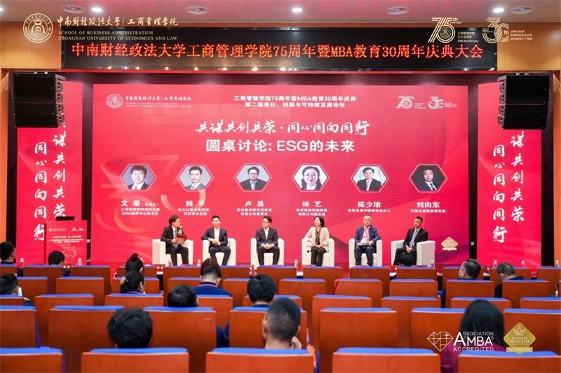 论坛圆桌环节由副院长兼MBA教育中心副主任文豪教授主持,邀请了长江证券总裁助理、长江资本总裁韩平先生,MBA2014级校友、武汉顺合新能源投资有限公司董事长卢昊先生,MBA2011级校友、宝武集团鄂城钢铁有限公司副总裁杨艺女士,普华永道中国资深合伙人陈少瑜先生,中国证券报新闻总监刘向东先生5位嘉宾参与,围绕“ESG的未来”这一主题展开讨论。