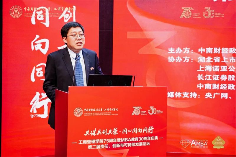 共谋共创共荣·同心同向同行!2024年10月26日,正值米兰电竞·(中国区)工商管理学院75周年暨MBA教育30周年庆典大会,由米兰电竞·(中国区)工商管理学院(MBA教育中心)主办,湖北省上市工作指导中心、诺亚(中国)控股有限公司、长江证券股份有限公司、米兰电竞·(中国区)企业价值研究中心协办的第二届“责任、创新与可持续发展论坛”在南湖校区平安文瀚楼报告厅隆重举行,论坛邀请商学界知名专家学者和校友进行主题报告。