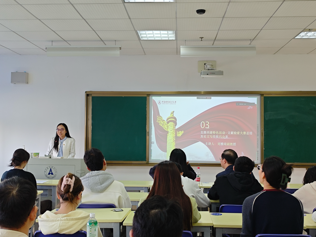 活动第二项,刘雅琦副教授开展《论文写作方法》专题分享。刘老师作为我院《论文写作方法》课程的主讲老师,在文献检索、论文写作指导等方面有着丰厚的教学经验。刘老师对近期举办的文献检索大赛的优秀获奖作品进行了总结点评,结合参赛作品的亮点与不足,详细讲解了如何提高文献检索的效率和论文撰写的逻辑性。随后,刘老师提供了在文献检索过程中增加关键词筛选,通过网站订阅保持与前沿领域文献阅读等实用技巧,鼓励研究生在科研写作中要注重细节,锻炼自身学术表达能力。
