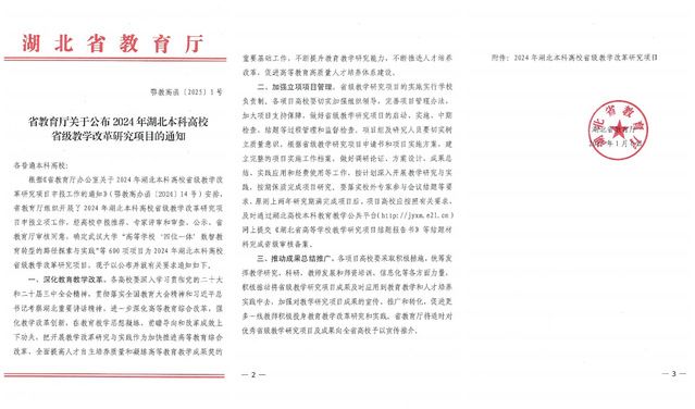 (通讯员 张景瑜 董林康)近日,湖北省教育厅发布《省教育厅关于公布2024年湖北本科高校省级教学改革研究项目的通知》(鄂教高函〔2025〕1号),我校7个研究生教育项目获批立项。