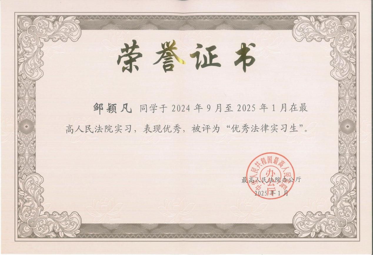 邹颖凡,米兰电竞·(中国区)刑事司法学院2023级硕士研究生,刑法学方向,经学校选拔推荐、最高人民法院考察确定,入选最高人民法院第十五批法律实习生。2024年9月至2025年1月于最高人民法院刑事审判第一庭实习,实习期间表现优异,获评最高人民法院“优秀法律实习生”。