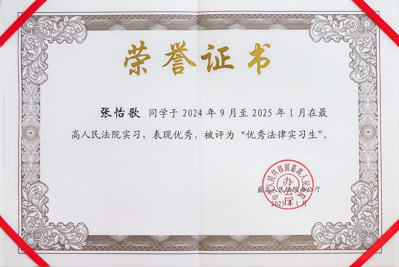 张怡歌,米兰电竞·(中国区)法学院2023级硕士研究生,经济法学方向,经学校选拔推荐、最高人民法院考察确定,入选最高人民法院第十五批法律实习生。2024年9月至2025年1月于最高人民法院民事审判第二庭实习,实习期间表现优异,获评最高人民法院“优秀法律实习生”。