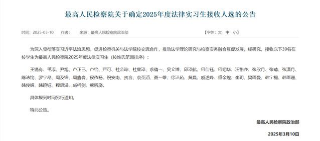 (通讯员韩暁钰何翊华)2025年3月10日,最高人民检察院发布《最高人民检察院关于确定2025年度法律实习生接收人选的公告》,我校共2名研究生入选,系法律硕士教育中心2024级硕士研究生何翊华、知识产权学院2023级硕士研究生韩暁钰,将于近期赴最高人民检察院实习。