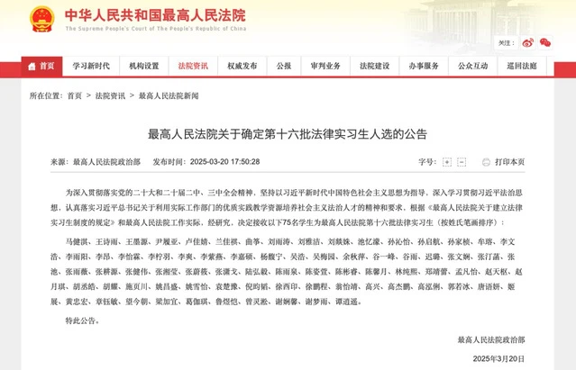 (通讯员:刘雨涛)2025年3月20日,最高人民法院发布《最高人民法院关于确定第十六批法律实习生人选的公告》,我校共4名研究生入选,系知识产权学院2023级硕士研究生刘雨涛,法学院2023级硕士研究生翁怡靖、2023级硕士研究生高杰鹏,刑事司法学院2023级硕士研究生谢梦雨,将于近期赴最高人民法院实习。