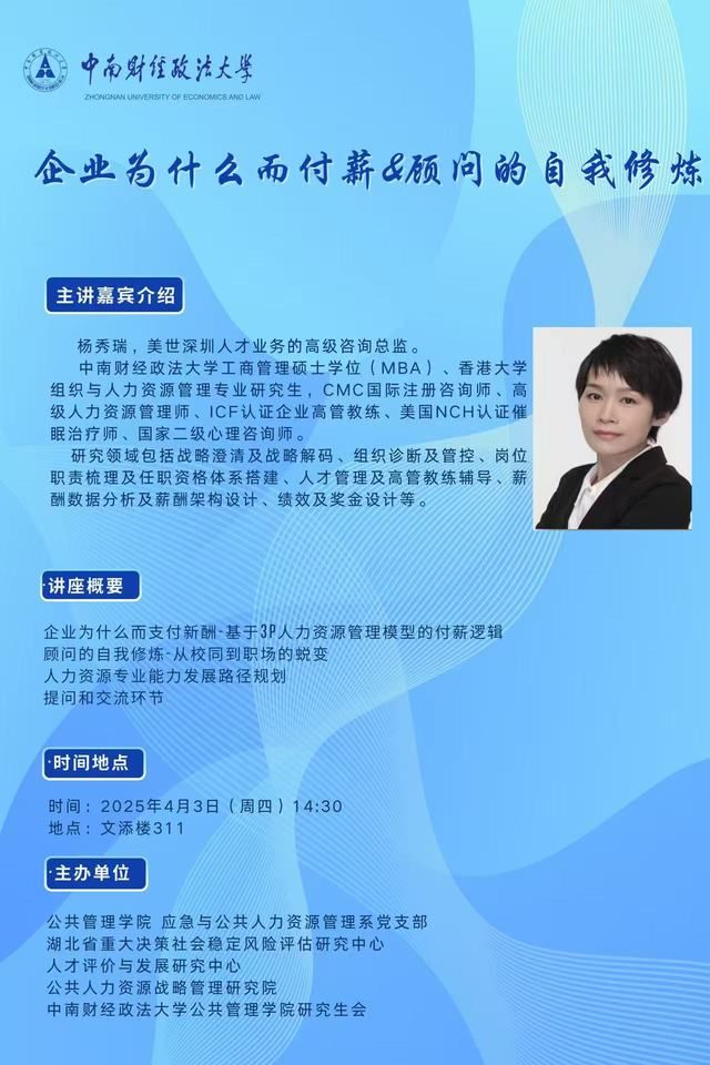 讲座简介:本次讲座将围绕“企业为什么而付薪以及顾问的自我修炼”核心问题展开,深入探讨薪酬体系设计的本质与逻辑。内容涵盖薪酬调研与架构搭建、3P管理模型、绩效管理与顾问与客户的关系、如何更全面的了解客户等关键主题,为大家带来相关知识讲解,从而使得研究生同学们能够更好的掌握人力资源管理的相关知识,提升自己的能力从而更好的胜任未来的工作岗位。