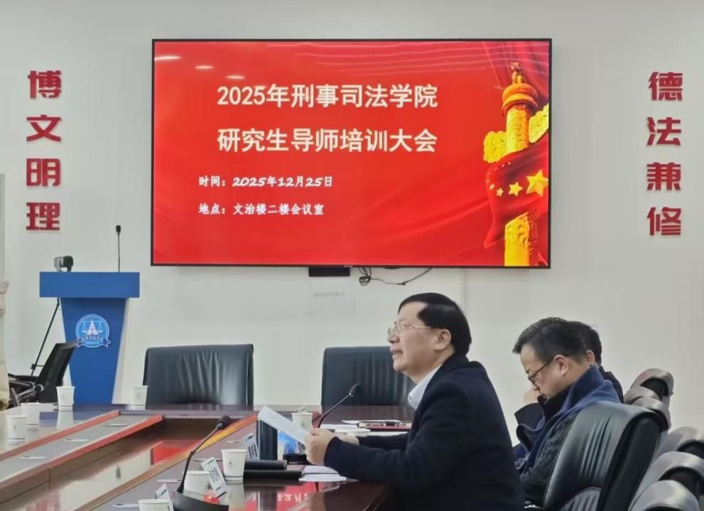为进一步加强导师队伍建设,切实提高研究生导师队伍的整体水平和研究生教育培养质量,确保学术指导的高标准和专业性,12月25日下午3:30,刑事司法学院于文治楼二楼会议室召开2025年研究生导师培训大会。刑事司法学院院长董邦俊教授、副院长焦俊峰教授、副院长周凌教授以及各位研究生导师出席会议,会议由院长董邦俊主持。