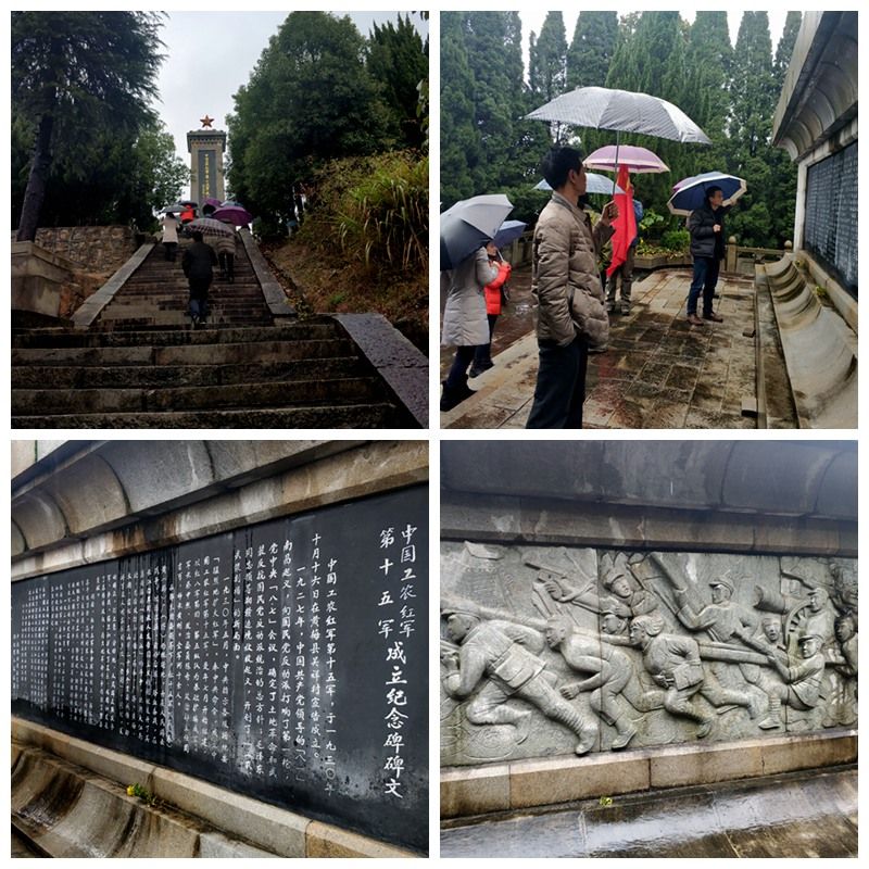 红十五军纪念碑依山而立,一眼望去满是青松翠柏,安静祥和。拾级而上,一座座革命先烈的墓碑进入我们的视线,气氛愈加庄严肃穆,我们的心情也愈发沉重。山顶是红十五军纪念碑的主碑,纪念碑的顶部是一个彩色的中国共产党党徽,碑的背面刻着几个大字:英雄伟绩与世长存。虽已远离那个战火纷飞、枪林弹雨的年代,但这一群革命人士随时准备为党和人民牺牲一切的精神值得我们严肃学习、深刻悼念。