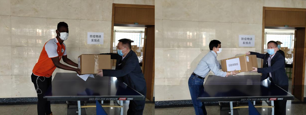 党委副书记、校长杨灿明为留学生代表,来自贝宁的经济学院2019级博士生汉乐发放了在校留学生的防疫物资,对留学生志愿团队的服务工作表达了高度赞扬;杨校长向后勤保障部代表周勇发放部门防疫物资,对一线防疫部门三个多月来的工作和付出表示了慰问、肯定和勉励。