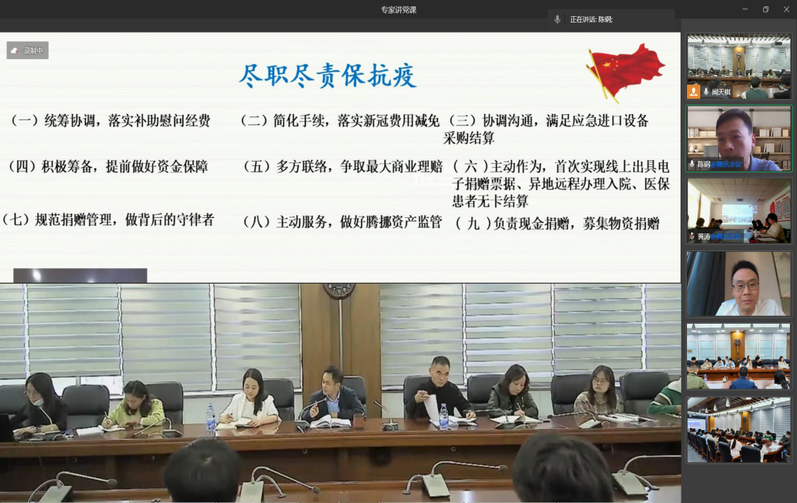 (通讯员 刘月)为迎接党的二十大胜利召开,加强党员奋进担当、廉洁自律学习教育,10月13日下午,资产管理部党支部联合财务部党支部、校医院党委开展了一场主题教育专题党课,活动邀请武汉大学中南医院大内科总支书记、我校校外硕士生导师陈钢讲授党课。本次活动由资产管理部党支部书记代伟同志主持,鉴于疫情防控要求,党课活动以线上与线下相结合的形式开展,财务部党支部、校医院党委通过线上连线方式参加了此次党课学习。为深入基层联系学生,活动还邀请了与我支部结对共建的金融2103团支部参与学习讨论。