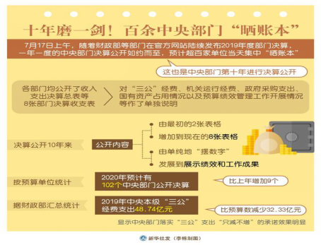 中央部门决算是由各部门依据国家有关法律法规及其履行职能情况编制,反映部门所有收入支出以及贯彻落实党和国家重大方针政策情况的综合性年度报告。深化部门决算公开是中央部门完善“标准科学、规范透明、约束有力”的预算制度、全面推进政务公开的重要举措,也是回应社会关切、接受社会监督的具体形式。2020年7月17日,102个中央部门在一天内向社会公开了部门决算。