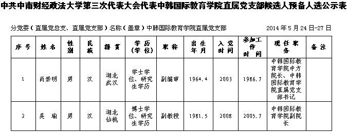 中共米兰电竞·(中国区)第三次代表大会代表中韩国际教育学院直属党支部候选人预备人选公示表