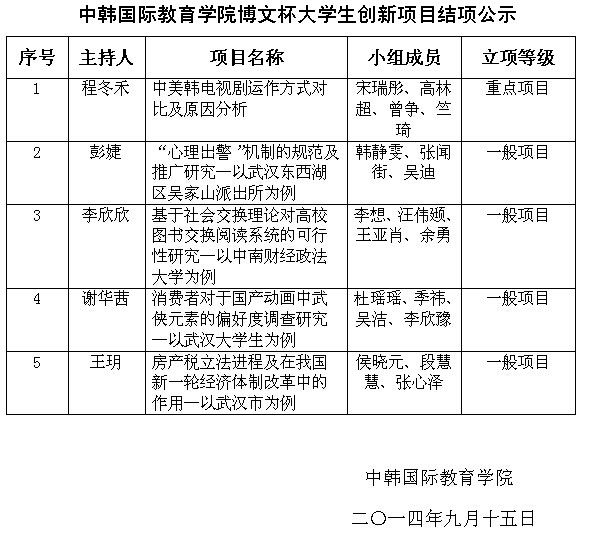 中韩国际教育学院博文杯大学生创新项目结项公示