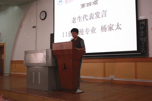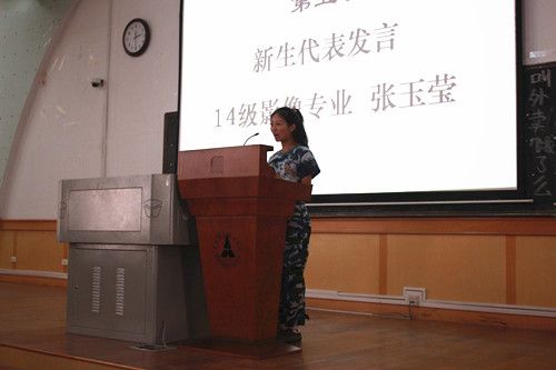 紧接着动漫专业11级老生代表杨家太同学发言,他主要是从大四学生的角度来介绍了一下中韩国际教育学院的专业情况,以及过去的三年多来在在中国和在韩国的一些具体情况,为新生们指点迷津。14级影像专业新生代表张玉莹代表新生发言,表达了对大学四年时光的期待,并表达了在大学中努力学习的誓愿。