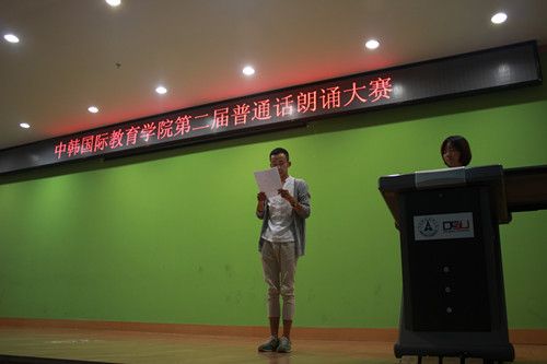 中韩国际教育学院普通话宣传周系列活动顺利落下帷幕 (通讯员 鲁雯 )为弘扬中华民族文化,弘扬民族精神,全面推广使用普通话,扎实实施素质教育,创建文明的校园文化氛围,我院组织了诗歌朗诵比赛以及汉字书法大赛。诗歌朗诵比赛的主题是“中国情,爱国情”,汉字书写大赛不设主题,自由发挥。目的是培养大家学习普通话的兴趣,提高普通话水平,激发大家热爱祖国、热爱生活的激情,大力弘扬爱国主义精神。本次活动经过近半个月的筹备,已于9月25日顺利结束。 学院领导非常重视,大力支持,各年级辅导员老师也大力配合,积极动员学生们参与到普通话宣传周的活动中来。学院专门印制了宣传海报和大幅展板,放置在学院大厅以及公告栏中,吸引了不少同学的关注。 9月25日下午,在文济楼201大讲堂举行了学院“中国情·爱国情”第二届普通话朗诵大赛决赛。初赛吸引了19名同学的积极参与与报名,经过激烈的角逐9名同学进入到了决赛,学院把比分排在前四名的同学推荐到学校继续参加下一个阶段的比赛。在本次比赛过程中,《相信未来》、《祖国我爱你》、《祖国啊,我亲爱的祖国》等一系列经典爱国诗歌在耳畔又一次响起。动漫1402班的李题同学把《赞美》诵出了自己的风格,影像1405班的唐硕同学更是吟咏起自创诗歌《年轻的战场》,台下掌声不断。 截止9月24日,学院积极开展汉子书写大赛作品征集活动,有十多名同学都递交了参赛作品。9月25日,经学院选拔,将其中4名优秀作品的作者推荐到学校参加进一步的比赛。 通过这次活动,不仅再一次宣传了普通话,更是通过活动激发了同学们参加朗诵与书法比赛活动的热情,涌现出了不少优秀选手。同学们也纷纷表示,如果有机会还希望继续参加这样有意义的活动。