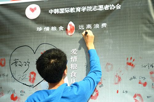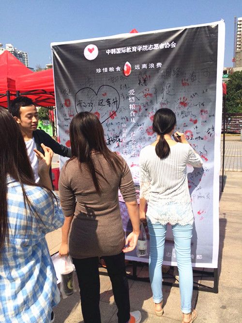 (通讯员:刘云琦、徐文蕴)2014年10月24日,为响应“世界粮食日”的精神号召,中韩国际教育学院青年志愿者协会在五羊广场举办了以“节约粮食”为主题的宣传活动。我校学生在我院志协的号召下,积极地参与到了此次活动中。