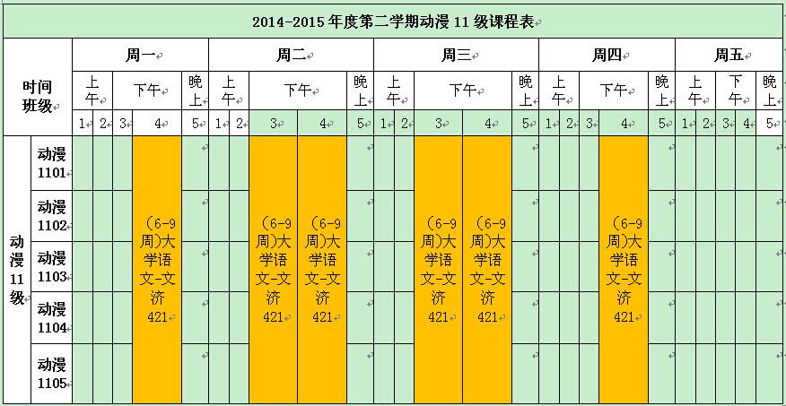 根据2011级的全程培养方案和教务部要求,《大学语文》为通识必修课程。为确保同学们顺利毕业,经学院与教务处、新闻学院沟通,定于2014—2015第二学期开设《大学语文》课程,具体上课时间如下,请各班同学按照时间准时上课。