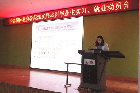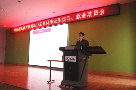 新闻网讯(通讯员 李涛)为让2016届毕业生了解暑期实习及大四学年教学安排,认清当下就业形势,为毕业年就业做好准备。7月11日下午两点半,中韩国际教育学院2016届毕业生实习、就业动员会在文济楼201召开。中韩国际教育学院中方院长兼直属党总支书记祝振炎、韩方院长权世振、中方副院长吴瑜、直属党总支副书记刘晓燕、韩方副院长韩明熙及各专业老师、2016届辅导员及2016届毕业生参加了此次会议。会议由2016届毕业生辅导员李涛主持。