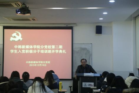 新闻网讯(通讯员 畅雅莉 杨颜 余典) 12月19日晚,中韩新媒体学院分党校第二期入党积极分子培训班在文济楼312教室开班。中韩新媒体学院中方院长兼直属党总支书记祝振炎,直属党总支副书记刘晓燕以及学院各年级辅导员出席开班典礼。2014级、2015级入党积极分子参加。开班典礼由2014级辅导员畅雅莉主持。