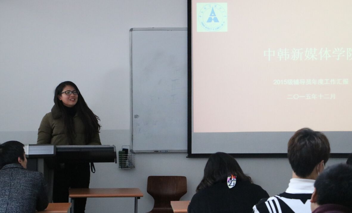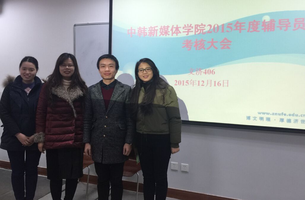 本网讯(通讯员畅雅莉)12月16日中午,中韩新媒体学院2015年度辅导员考核大会在文济楼406举行。中韩新媒体学院直属党总支书记兼中方院长祝振炎、直属党总支副书记刘晓燕组成2015年度辅导员工作考核领导小组,党政办公室主任施芸芸、视觉传达设计教研室主任祁璇、电影教研室郑爽、教学秘书鲁雯老师及37名学生代表参加了考核大会。大会由刘晓燕主持。