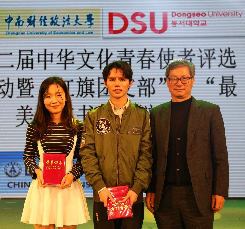 最终,来自动漫1504班的宋晨希同学凭借其思路清晰的叙述、温馨有趣的主题及多样化的作品形式荣获本次“青春使者”活动的一等奖,我院中方院长兼直属党总支书记祝振炎先生上台为他颁奖。