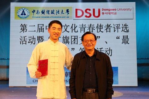 首先上场的是从“青春使者”初赛、复赛中突围的十位选手,他们依次按抽签顺序进行个人作品答辩,内容涵盖了孝敬父母、热爱祖国及关心社会空巢老人等社会热点问题,深刻把握“品读经典·活力青春·孝心孝行 ”的活动主题,体现出当代学子对于亲情的重视,对社会责任的担当。答辩中,选手们的演讲多取之于自己的亲身经历,非常具有说服力,不仅打动了台下的评委老师,更赢得了同学们的热烈掌声。在第二轮的才艺展示环节,各位选手们带来的才艺也都各具特色——有融合了中西文化的芭蕾舞表演《梁祝》,美轮美奂;有体现民族精粹的功夫表演《动静之间》,飒爽畅快;有形式新颖的脱口秀《talk show我家的宝妈》,逗趣幽默;还有呼唤亲情与爱的深情歌曲《天亮了》,悠扬动人……可谓精彩纷呈,充分展现了中韩学子的风采。