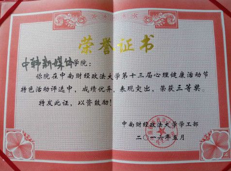 我院第三届心理健康活动节作为学校心理健康活动节的重要组成部分,于2016年3-4月开展了以“为爱点赞·青春担当”为主题的系列特色活动,包括心灵之旅——心理健康征文、摄影、摄像大赛,心灵之约——家庭式心理分享会,我心飞扬——心理互动游戏等主题活动,活动得到全院各年级同学们的广泛参与。