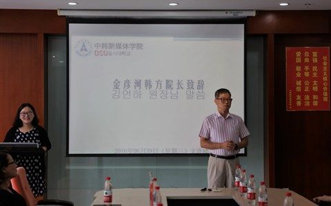 中韩新媒体学院韩方院长金彦河教授、党政办施芸芸主任、韩语教研室主任张熙英老师、金扶衡老师、金珍英老师、黄柱元老师参加并出席了本次活动。同时,张熙英老师主持了本次活动。颁奖仪式在金彦河院长的祝辞中拉开了帷幕。金院长对14级同学在韩语学习方面取得的好结果表达了认可与鼓励,同时也对他们即将到来的韩国生活也寄予了深切的希望。最后金院长从专业的发展前景及现在中韩两国的友好合作关系出发,分析现状并表达了对中韩学子的期待与祝福。