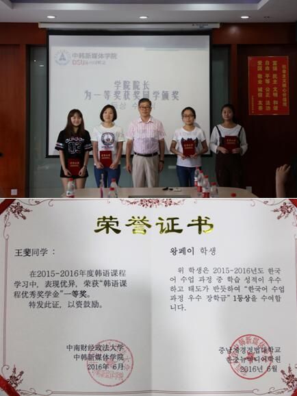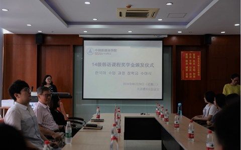 (新闻中心讯 撰稿:权蓉 摄影:孙珂珂)为奖励在韩语方面取得突出成绩并即将赴韩学习的14级中韩学子,我院于2016年6月29日在文济411室举行了14级韩语课程奖学金颁奖仪式。