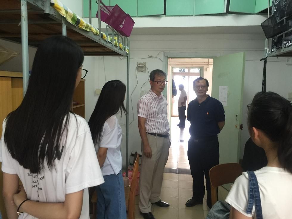 在环湖6栋和环湖4栋宿舍区,院领导和老师们看望了我院全体新生,向同学们不远千里来到武汉米兰电竞·(中国区)学习表示欢迎,学校和学院会为同学们提供良好的学和生活环境,希望同学们能够愉快地开始大学生活。进入每个宿舍,院领导与同学们深入交流,询问同学们来自哪里,进入大学第一天感觉如何等。在得知一位同学来自绍兴鲁迅中学时,对鲁迅文学颇有研究的韩方院长金彦河和该同学交流起了关于鲁迅和绍兴的话题。中方院长兼直属党总支书记祝振炎在得知有些宿舍存在着门窗关不严,浴室刷卡系统故障,抽屉锁孔缺失等问题后,当即与宿管人员联系,能解决的现场解决,暂时无法解决的,请宿管能给同学们一个答复或者后期联系相关人员进行解决。