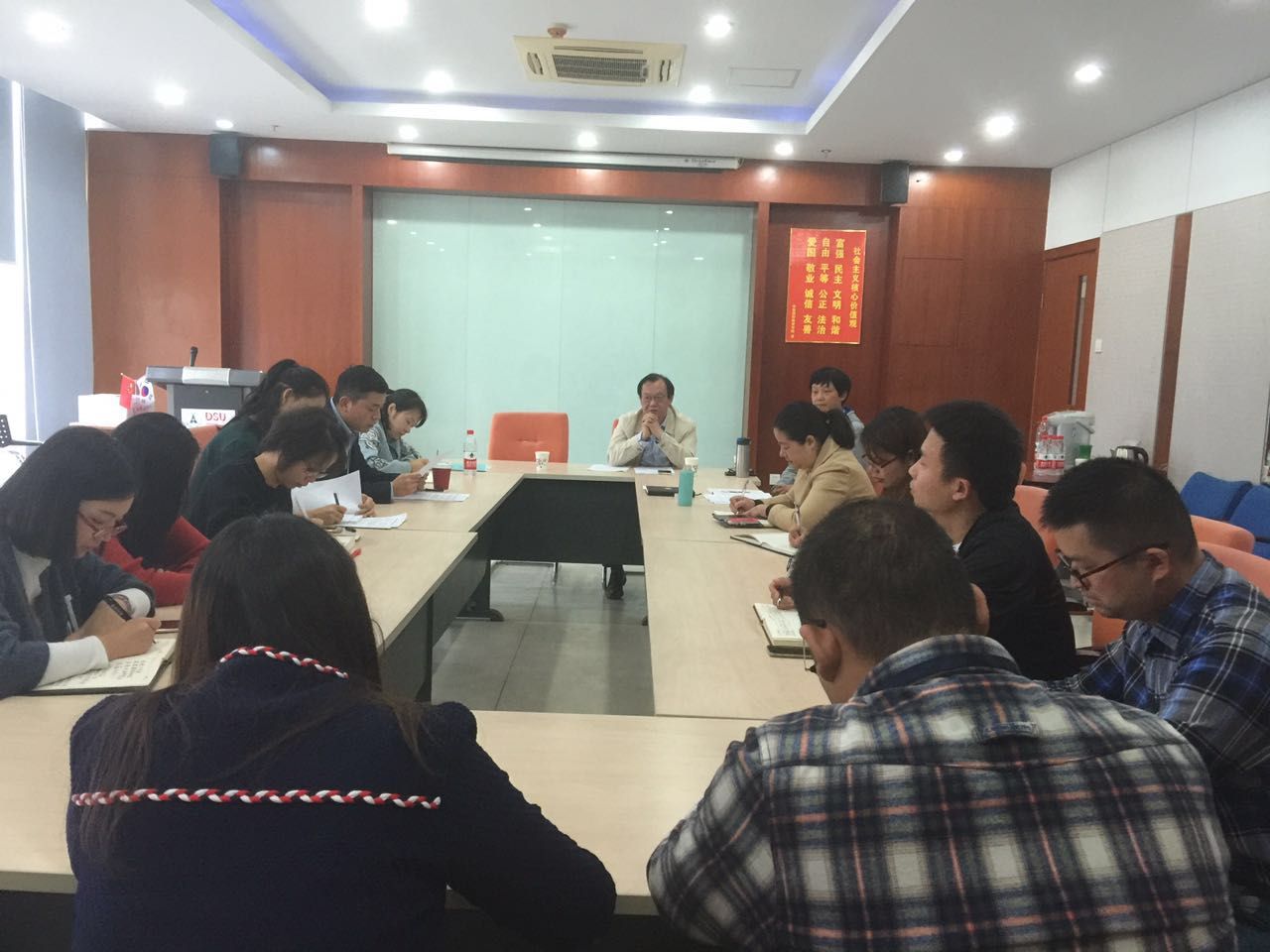 (通讯员:施芸芸)10月13日下午两点半,院领导班子和院行政党支部、教师党支部一起认真学习《关于在“两学一做”学习教育中组织开展严肃换届纪律专题学习的通知》的相关精神,并结合“支部主题党日”认真学习换届纪律的有关文件规定,结合警示教育,院领导和各支部党员联系思想和工作实际,谈认识、谈体会、谈感受。