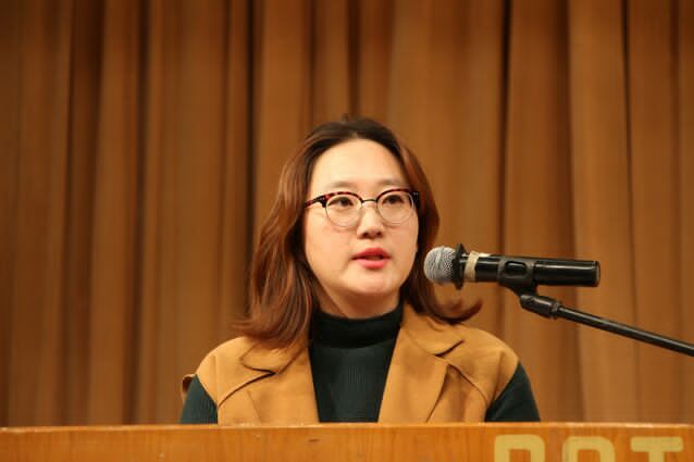 (图为中韩新媒体学院张熙英老师发表演讲)