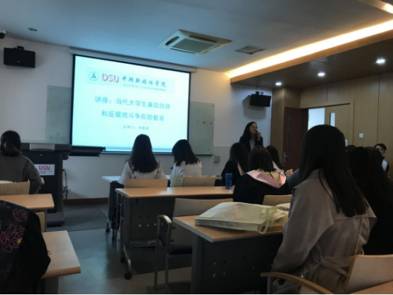 (通讯员畅雅莉田雪瑶)2018年4月26日上午,中韩新媒体学院在文济楼311教室为全院2018届毕业生开展了以“当代大学生廉政自律和反腐败斗争形势教育”为主题的廉政教育专题讲座,学院直属党总支副书记刘晓燕、学生党支部书记、2014级毕业班辅导员畅雅莉以及全体2018届毕业生参加了本次讲座。