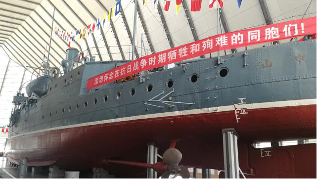 中山舰原名永丰舰,是一艘钢木结构的军舰,舰身上还保留着当时被敌军炮弹击打所留下的弹坑,战争的惨烈可见一斑。在博物馆的二楼与三楼,陈列着许多从舰上打捞出水的文物,有铭牌、生活用品和武器装备等,向学员们诉说着那段烽火硝烟的历史。