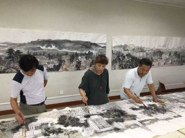 经过实地考察走访,画家们对中南大波澜壮阔的发展史有了更清晰的了解。他们一致认为创作这一巨幅长卷要有大情怀,展现大格局。为了能更好地表现当代校园的景象,他们在暑假顶着烈日,先后于南湖、首义校区写生。他们无数次在南湖从北门开始环绕校园,把每栋教学楼及周围环境都观察到位,对校园的花草名木都力求能够以写意的形式描绘出来。白天他们战高温,忙写生,晚上斗疲惫、商创意、制小稿,他们用学术创作,用感情泼墨,在2018年7月12日完成0.5*35米的小稿,又经反复打磨,于7月18日正式创作70米长卷。期间,党委书记栾永玉教授、校长杨灿明教授等领导多次来创作室看望和问候画家,“领导们在暑假期间经常来画室陪我们一起吃盒饭,同时对我们的创作提出建设性意见,令我们很是感动。”杨教授在采访中提到。