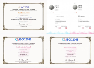我院三位老师参加论文发表,分别为金彦河院长论文《Zhang Yiqing’s Rosewood with Noble Character 君紫檀: From Zhouzhou to Gu Yongqi》;蔡一镇副院长论文《Developmentof Virtual Reality Training System for steel mill facility》;金在奎老师论文《The Transmedia storytelling strategy and structures of heroes in Marvel Avengers films》。在ICCT/CADI/ISCC 2018颁奖典礼上,我院蔡一镇副院长论文获得ICCT(国际文化技术大会)最优秀论文奖;电影学教研室老师方茜作品《A RAY OF SUNSHINE7》获得CADI(国际融合艺术与设计展览)最优秀创造力奖;学子吕元钊作品《One fish in the well》获得ISCC(国际学生挑战赛)最优秀创造力奖;学子赵蓉作品《Game of Low-Poly》获得创造力奖。展览通过科学·创新·融合的理念、多元化的国际平台,为专家、学者、学生提供了面对面的无障碍交流通道。期待学子们在大赛舞台中不断提升专业能力,在下一次的展览中有更多的同学能崭露头角,展示中韩学子风采。