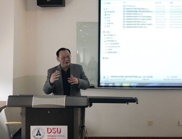 (新闻中心讯撰稿人叶莎莎)3月13日中午,中韩新媒体学院党总支委员董玉芝教授,为学院新闻中心的新闻部与摄影部全体成员召开新闻宣传工作业务培训。培训会在文济楼311举行,院长兼党总支书记祝振炎莅临致辞。