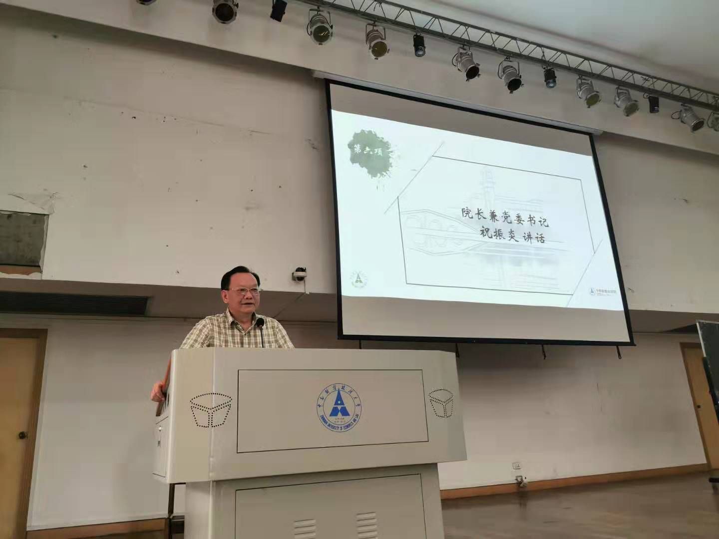 院长兼党总支书记祝振炎首先向同学介绍了“新文科”的概念,即新技术与传统人文学科的结合,我院电影学和视觉传达设计两个专业,正是这一概念的体现。因此,同学们一方面要努力学好本专业,另一方面要做到三个融合——本院两个专业的融合、两个专业和新媒体的融合以及两个专业同学校“经法管”优势学科的融合。除此之外,祝振炎还勉励2019级新生加强英语学习,提高人文底蕴,增强实践能力,提升团队协作精神。希望大家千里之行始于足下,从现在开始就全方位提高自身的综合竞争力。