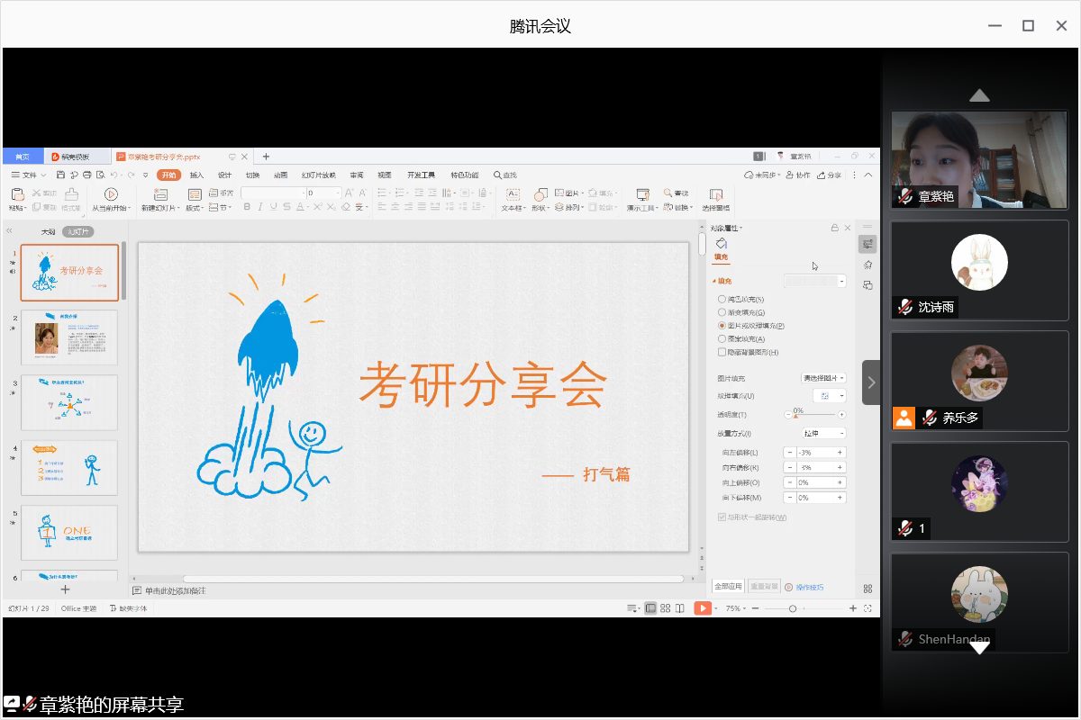 肖楚瑜、姜泽一方、章紫艳等三位考研成功上岸的16级学生分别进行了经验分享和注意事项讲解。