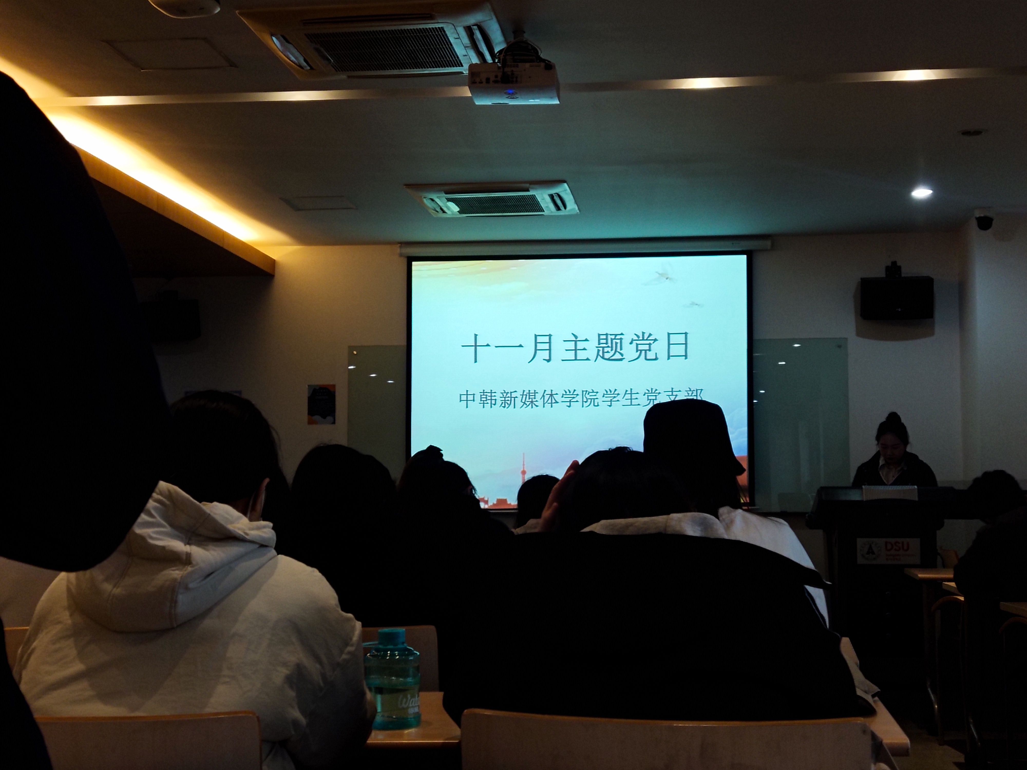 (新闻中心讯 通讯员 胡鹏翔)11月22日下午14时30分,中韩新媒体学院学生党支部在文济楼312教室开展11月份主题党日活动,支部全体党员准时参加,活动由学生党员段贾成琛主持。
