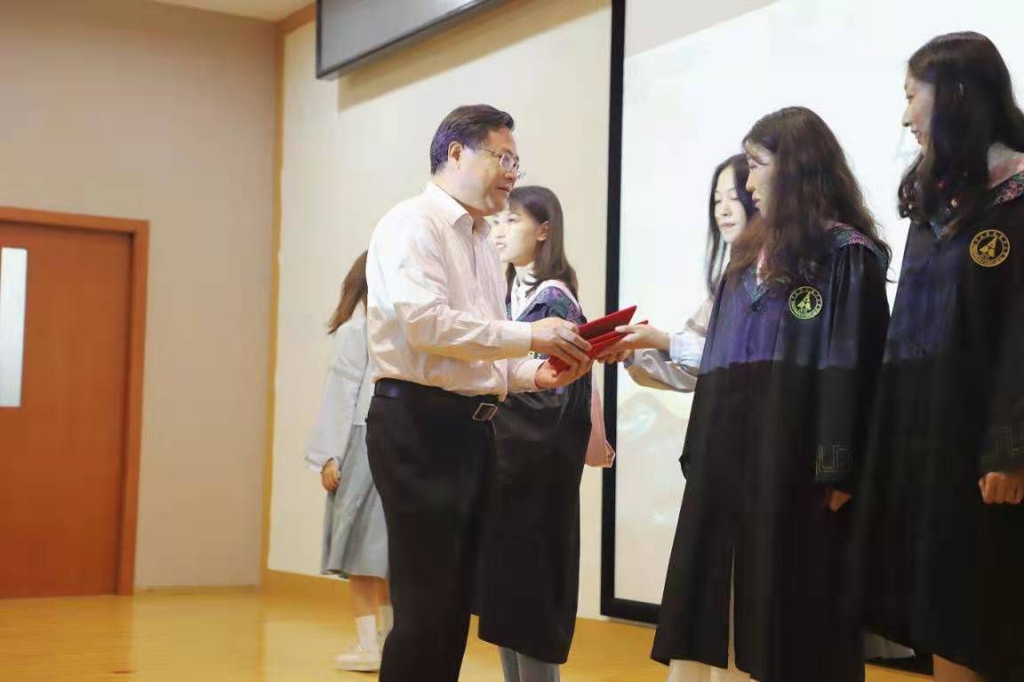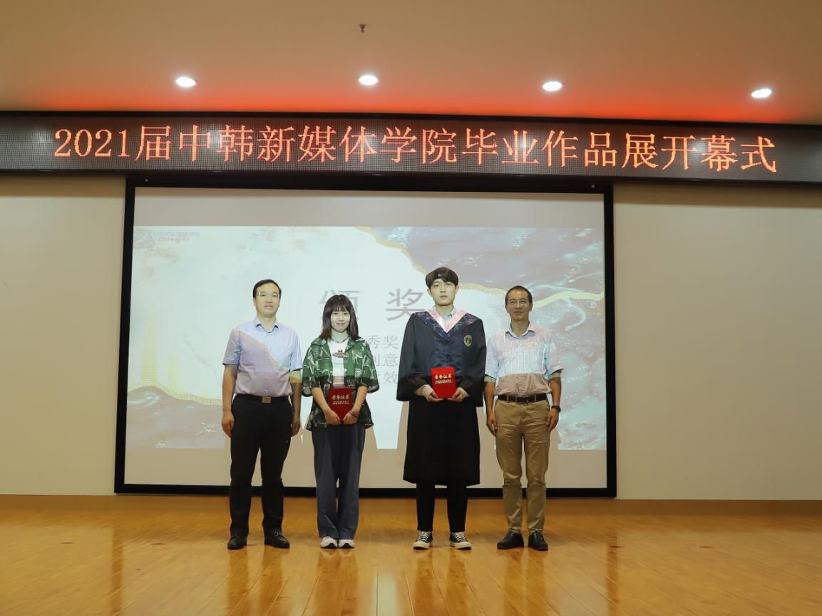 教务部副部长邓松、中韩新媒体学院党委副书记刘晓燕为获奖学生颁奖