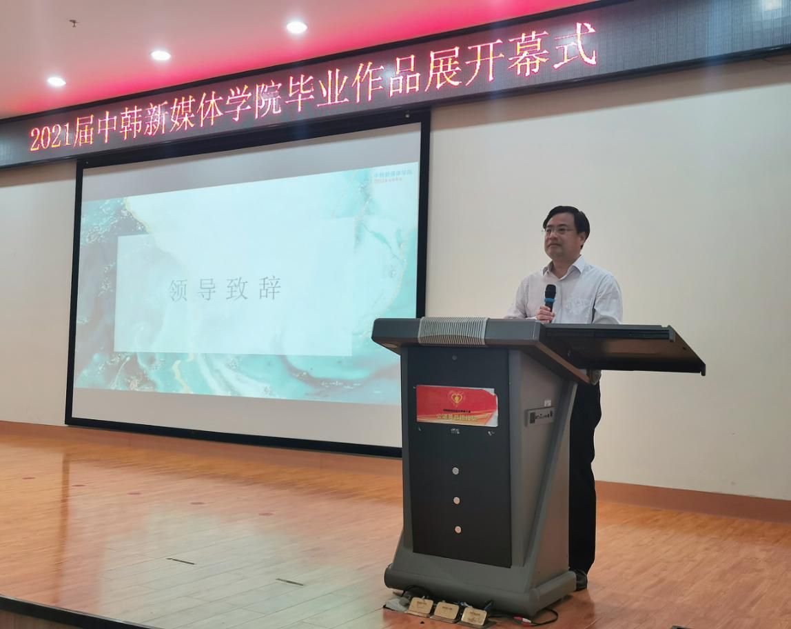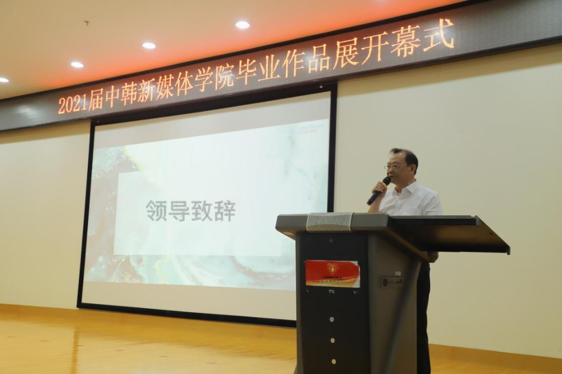 校党委副书记、纪委书记侯振发在致辞中向为毕业作品展提供支持的师生家长们表示感谢,他指出:时值建党百年之际,中韩学子紧扣时代命题,创新选题,融入艺术审美,弘扬社会主义核心价值观,彰显主旋律,传播正能量,这次作品展不仅是毕业生专业水平的自我检验,凸显了学院创新发展的理念;也是学校推进新文科建设,提升美育实践,强化人文学科融通发展的成果。侯振发还勉励即将毕业的2021届毕业生,希望同学们坚持初心使命、汲取新知识,掌握新技术,实事求是,锐意进取,继续创作出更优秀的影像、动漫作品;希望同学们在以后的学习工作中,对自己有信心,对未来做事要有决心,对成就自己的事业要有耐心,不断培育宽和、仁爱的美好心灵,做一名勇于创新,为社会做贡献的优秀人才。