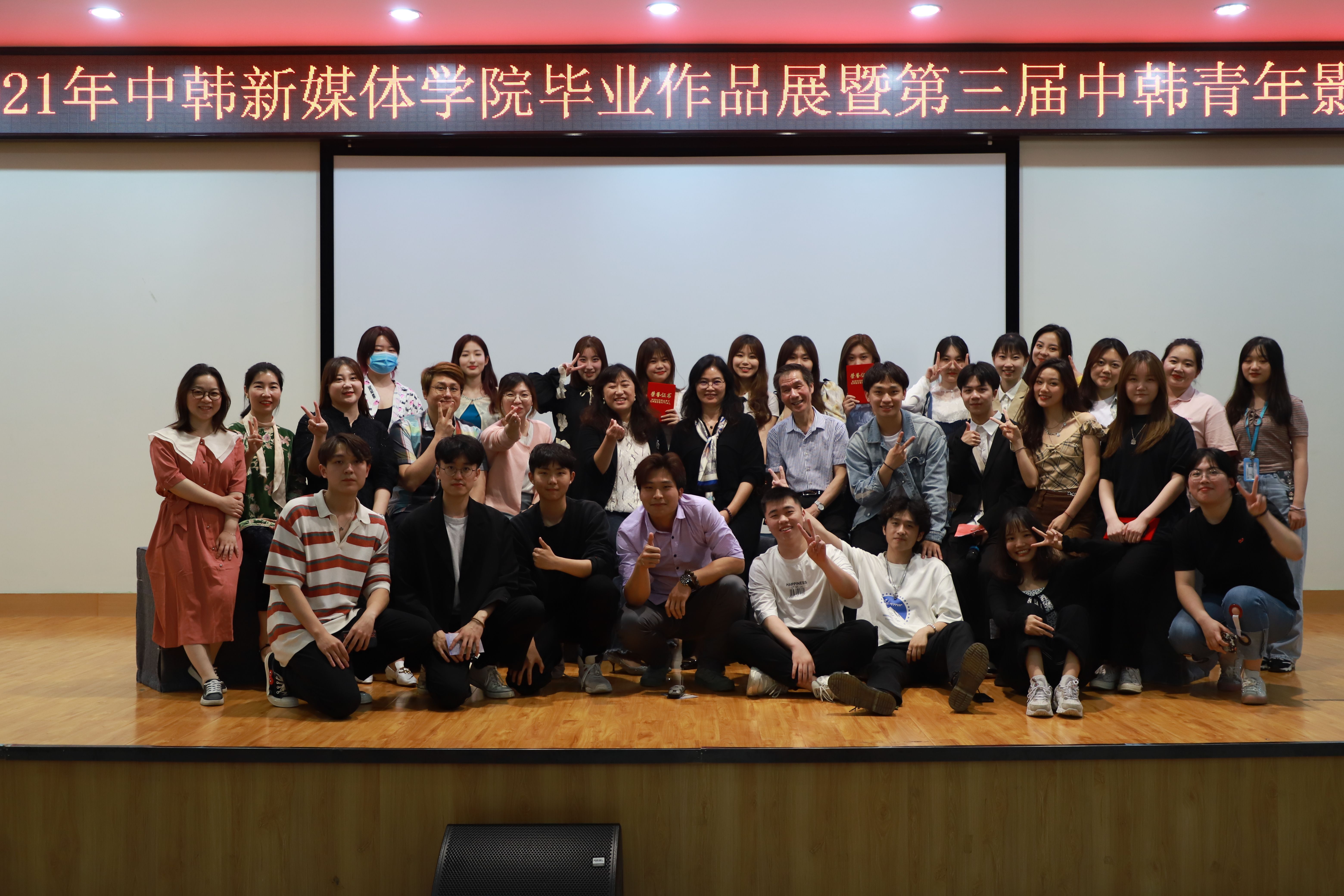 ( 通讯员:袁品芳、吕叶菲)5月8日上午,中韩新媒体学院2021届优秀毕业作品展既第三届青年影展开幕式在文济楼201举行,这次影展以“城市的回响”为主题。校党委副书记、纪委书记侯振发,学生工作部部长兼人武部部长余小朋,就业指导中心主任温习,教务部副部长邓松,中韩新媒体学院院长、党委书记祝振炎、党委副书记刘晓燕,副院长董玉芝、韩方副院长崔哲荣,以及中韩双方全体教师和2021届毕业生出席,开幕式由中韩新媒体学院教师马志远主持。